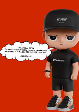 В Zamess® действует акция: скидка 50% на все товары с цифровыми размерами: 44, 46,48, 50, 52, 54, 56 из категорий: Верхняя одежда, толстовки, футболки, штаны. Предложение действует ограниченное время.